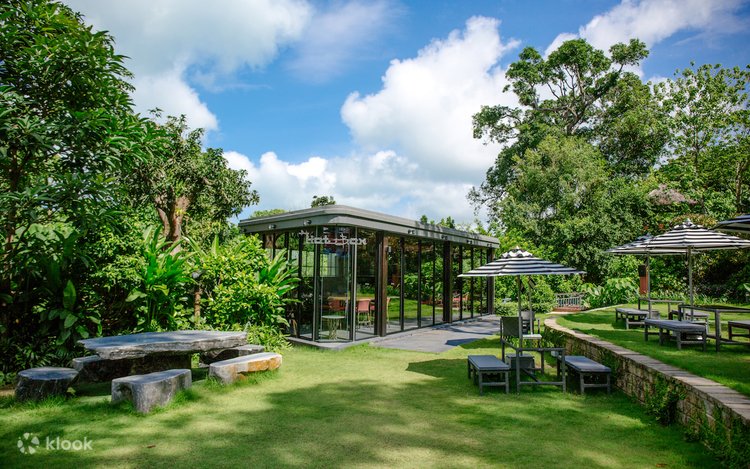 Surrounded by lush greenery and blue skies, it's the perfect way to take a break from the busy city