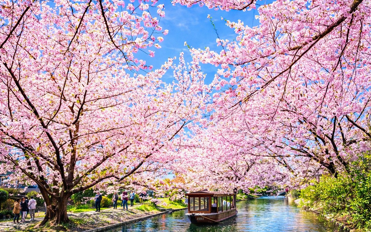 • Fushimi Jikkokubune: weeping willows line the banks, and pink cherry blossoms hang low to the water surface, forming a dreamy "cherry blossom tunnel" that is breathtaking!