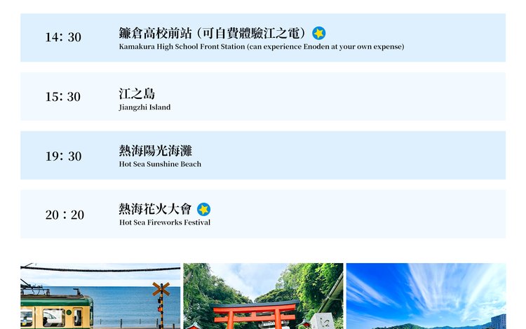 • Please be sure to arrive at the designated meeting point at the specified time and do not be late. As this tour cannot be changed to other services or joined midway, you will be responsible for any losses incurred if you are unable to participate in the day trip due to your own reasons. Thank you for your understanding.