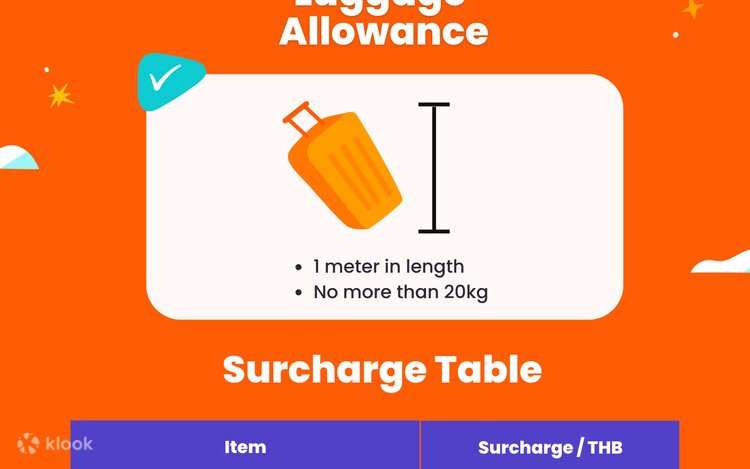 - You can bring a luggage bag up to 1 meter in length, free of charge. Bags between 1-1.5 meters in length will incur an extra charge of THB150, to be paid in cash directly to the operator. Bags bigger than 1.5 meters will not be allowed on-board