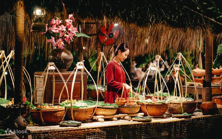 Buffet Quê Xưa-Nha Trang Xưa is an ideal place to enjoy traditional Vietnamese cuisine in a cozy and rustic setting. Located in the heart of Nha Trang city, the restaurant stands out with its design inspired by the Northern countryside, featuring thatched roofs, bamboo accents, and simple wooden furniture that create a warm and familiar atmosphere.