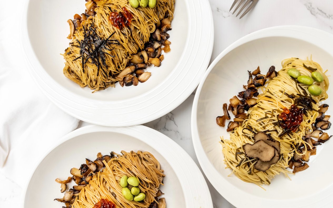 Angel hair pasta paired with sautéed shitake mushrooms, boiled edamame, vegan caviar, and black truffle shavings