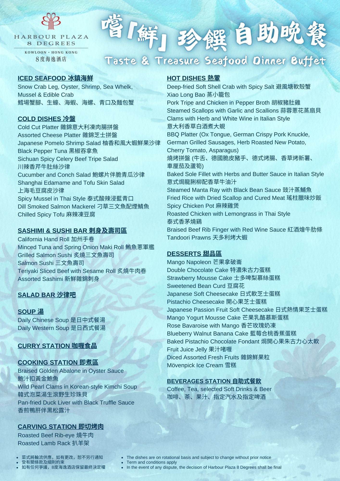 Café 8 Degrees presents “Taste & Treasure Seafood Dinner Buffet” for you, offering a wide array of fresh seafood and global delicacies. The main highlights include Freshly Shucked Oysters, Snow Crab Leg, Edible Crab, Clams with Herb and White Wine in Italian Style, Pan-fried Duck Liver with Black Truffle Sauce, Wild Pearl Clams in Korean-style Kimchi Soup, Steamed Scallops with Garlic and Scallions, Abalone with Scallion and Chicken Pot and a variety of exquisite desserts. Gather your family and friends now to savor the freshness and experience this extraordinary culinary feast! Menu