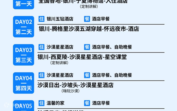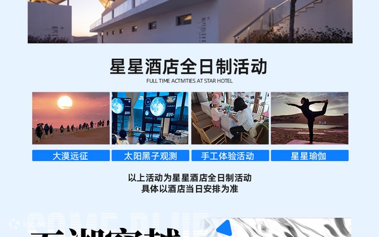 - [Ultimate Accommodation Experience] Stay two consecutive nights at the Desert Star Hotel in the Tengger Desert + a carefully selected five-diamond hotel in Yinchuan city.