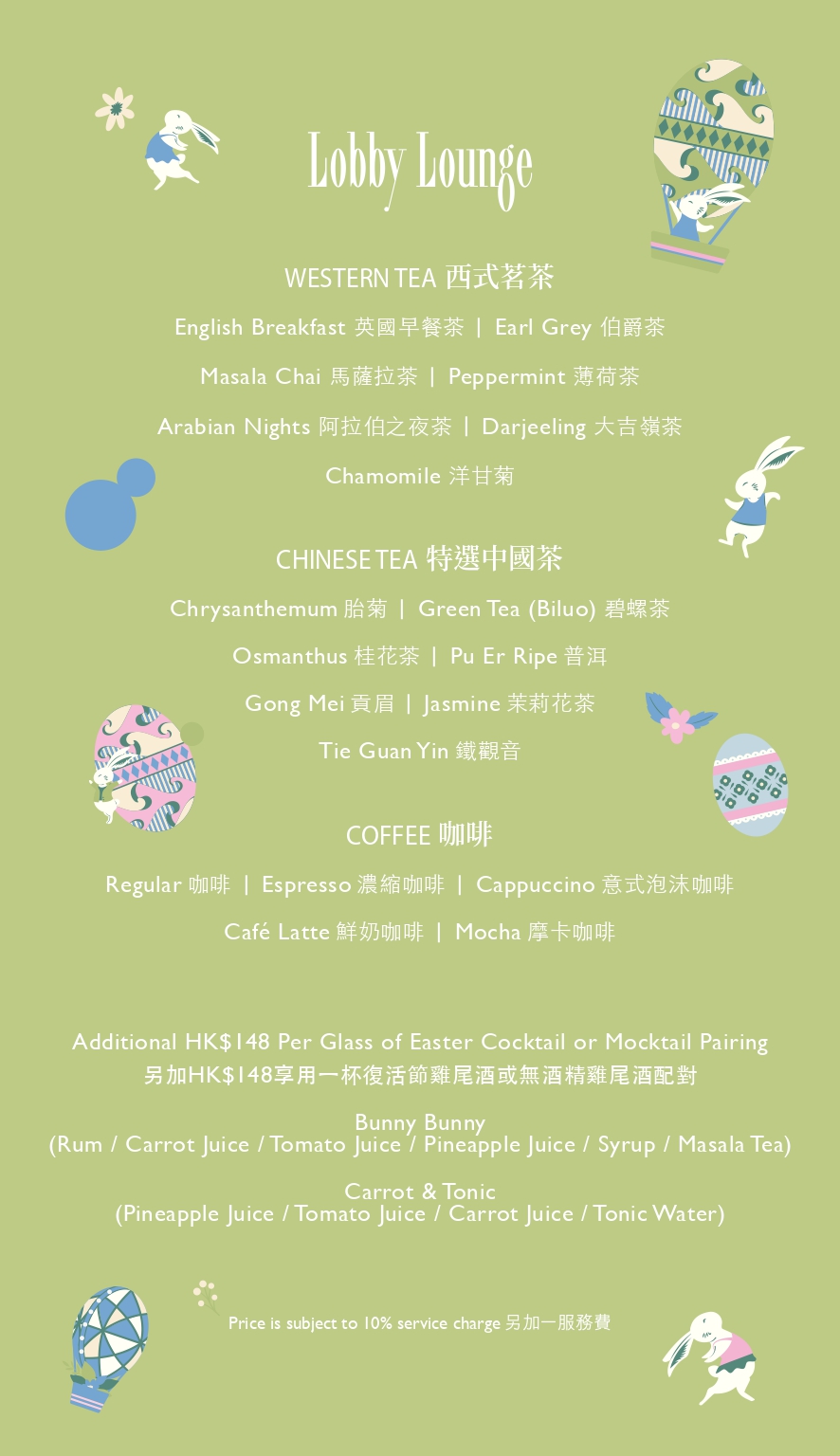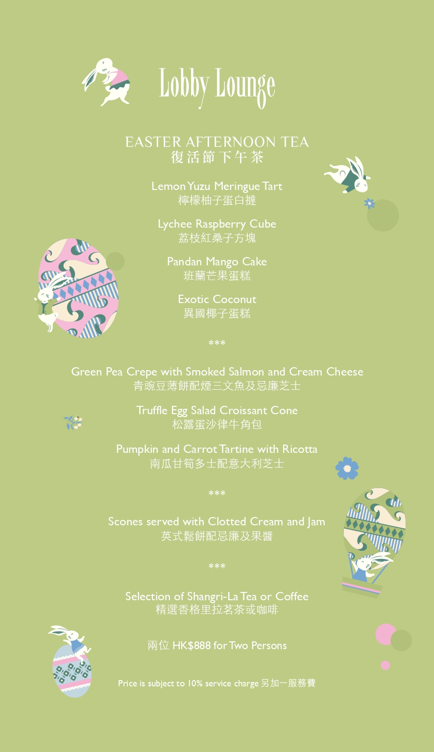 Hop into the spirit of spring at Lobby Lounge with our enchanting Easter Afternoon Tea. Our culinary team has reimagined seasonal flavours into a whimsical collection of savoury and sweet treasures, blending festive creativity with elegance to ensure a truly joyful and memorable celebration for you and your loved ones. Dishes Menu Drinks Menu Supply Period: 3-7 April 2026 Serving Time: Date: Saturday, Sunday and Public Holiday Time: First Seating: 2pm - 3:45pm; Second Seating: 4pm - 5:30pm Location: Lobby Lounge (6/F)