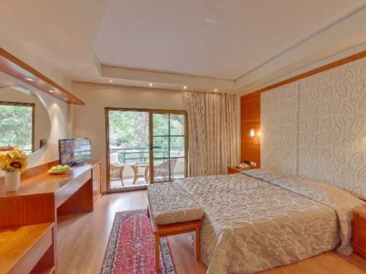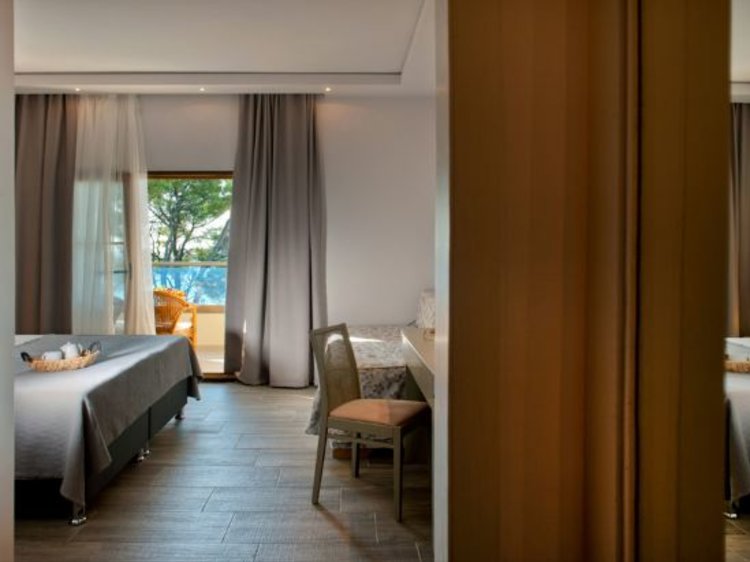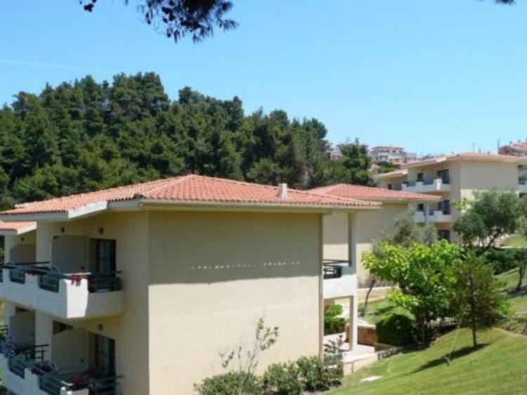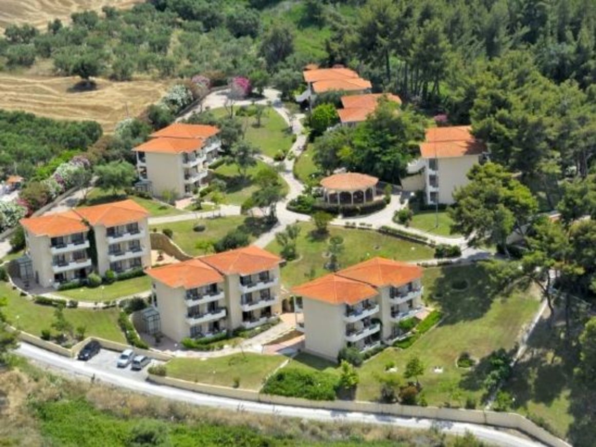 This holiday resort is located on the Kassandra peninsula in Halkidiki, on a 33,000 m2 plot surrounded by pine and olive trees, overlooking a golden sandy beach and the Aegean Sea. Even Mount Olympus, the legendary home of the Greek gods can be seen. The airport of Thessaloniki is 105 km away. The hotel features 124 rooms, 24-hours reception, currency exchange, free WIFI in all public areas, conference centre, TV room, 2 restaurants, 3 bars, outdoor pool, children's pool, playground, wellness, fitness centre, sports facilities, medical assistance, mini-market and laundry services.