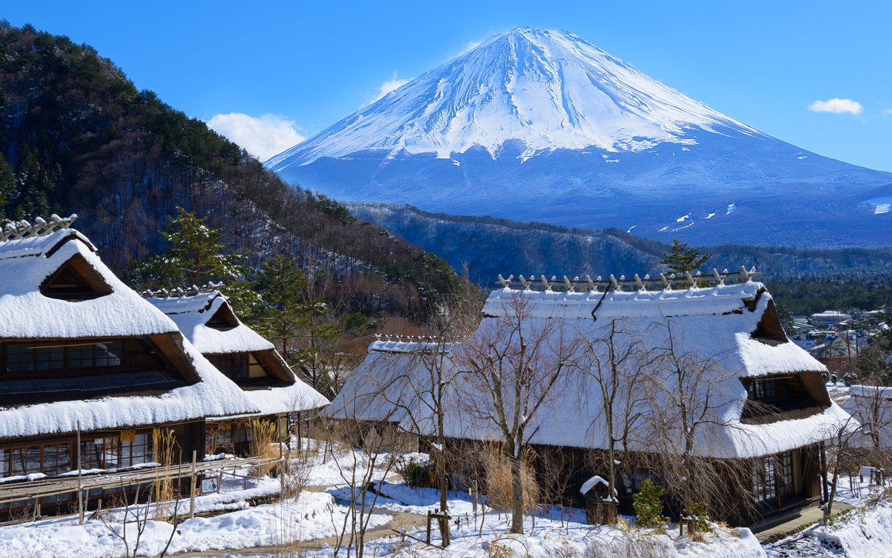 Stand at the observation point and enjoy a panoramic view of Mount Fuji, where the mountain peaks and Gassho-style roofs complement each other, creating a stunning picture.