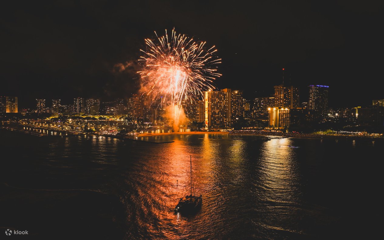 Enjoy prime seats on a luxurious vessel, watching fireworks and Waikiki’s sunset splendor