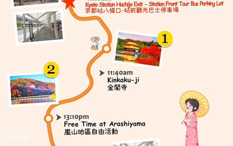 • Entering Kinkaku-ji in spring, the gold leaf architecture reflects cherry blossoms and lake water, showcasing Kyoto's most elegant and balanced spring scenery. * Stroll through Arashiyama, from Togetsukyo Bridge to the Bamboo Forest Path, slowing down the pace of travel amidst mountains, ancient temples, and cherry blossoms. * Enjoy cherry blossoms at Tenryu-ji Temple's Sogenchi Garden, where the pond, stone bridge, and distant mountains intertwine, revealing the beauty of Zen with every step. * Visit Nonomiya Shrine during the cherry blossom season, and feel the gentle romance of Kyoto in the quiet bamboo forest and pale pink sea of flowers. * Take the Arashiyama illuminated train at night, where the cherry blossoms under the lights flow like a dream, capturing the most fantastical moment of the spring night.