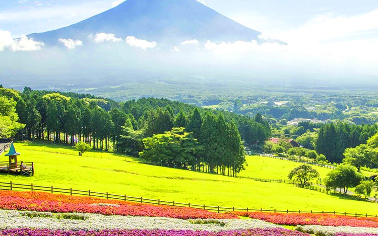 Limited-Time Views of Flower Fields with Mount Fuji Seasonal limited-time rainbow flower fields or lakeside gardens, with Mount Fuji as a backdrop, create a picture with a rich sense of depth.