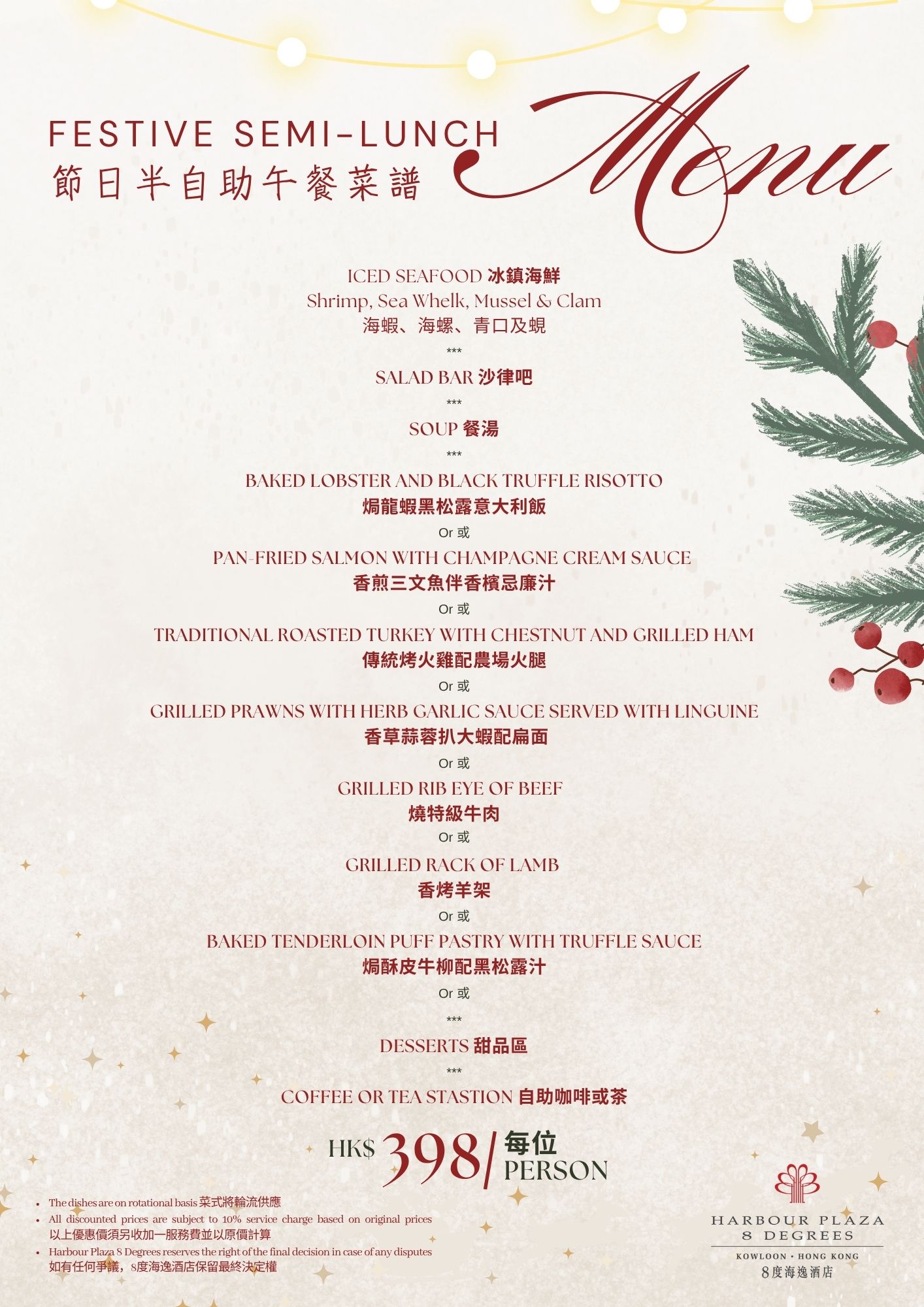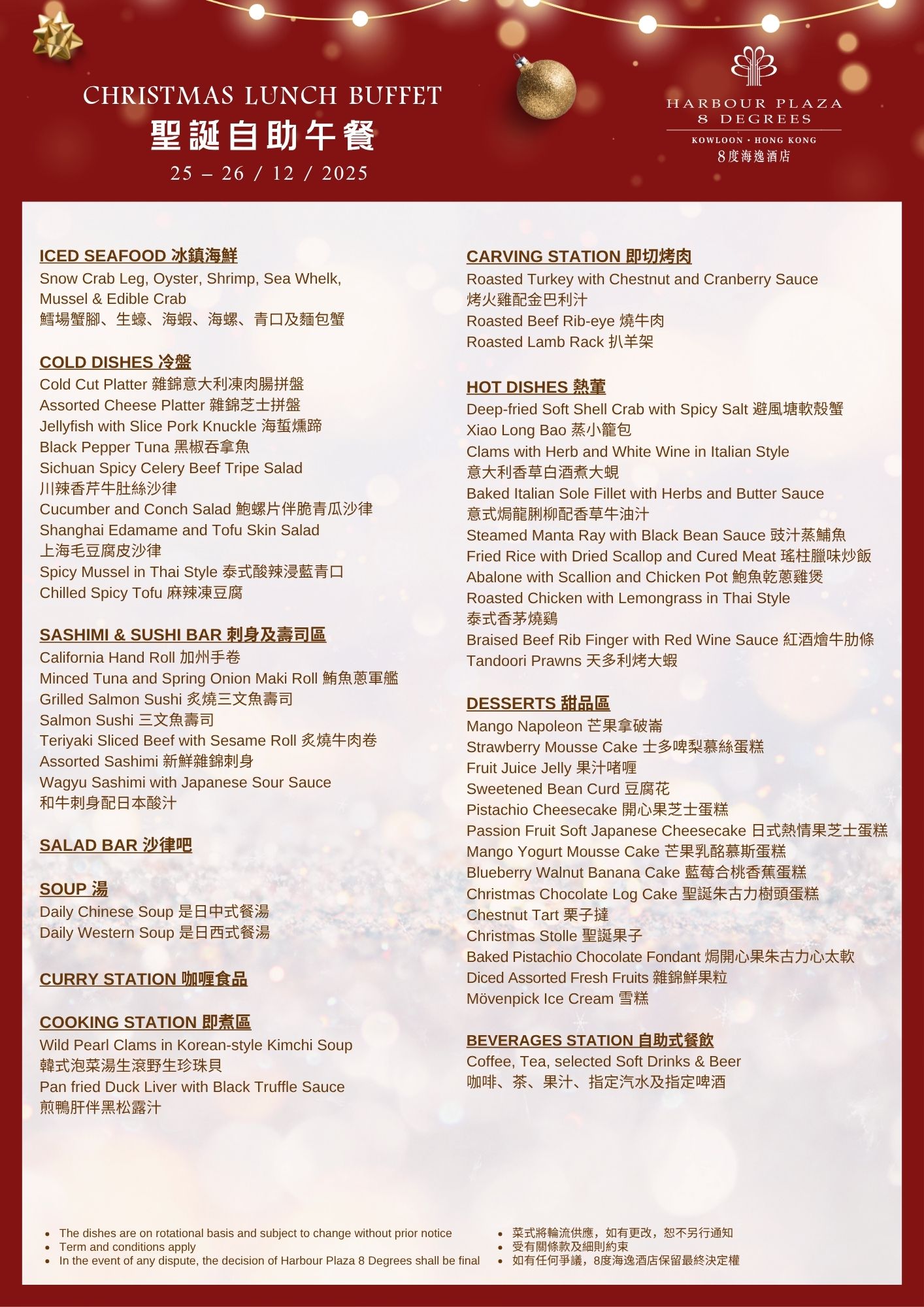 Celebrate this joyous season with an unforgettable Festive Semi-lunch Buffet! Whether it’s a family gathering or a corporate celebration, we present an array of exquisite delicacies for you, including unlimited selections of salads, soups, and desserts. Additionally, enjoy a specially crafted holiday main course meticulously prepared by our chef, designed to satisfy every craving. Book now and immerse yourself in the cheerful festive atmosphere! Menu (22-24 Dec 2025) Menu (15-19 & 29-31 Dec 2025)