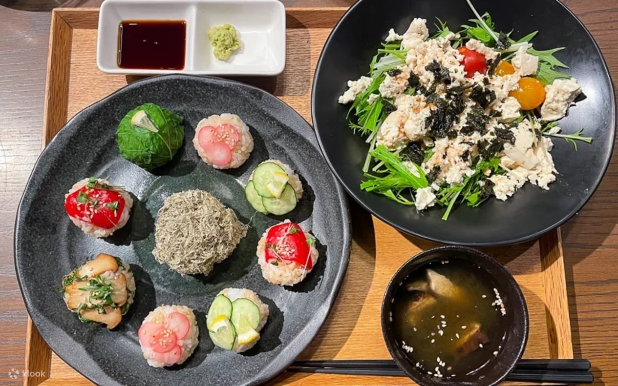 After introductions and a friendly explanation, prepare to create a plant-based feast. With locally sourced ingredients, craft a salad featuring seasonal vegetables and protein-rich tofu. Then, delve into the art of making temari sushi—adorably designed, ball-shaped sushi topped with intricately cut vegetables. Indulge in this nourishing meal, complemented by miso soup, all while enjoying stunning views of Tokyo Skytree and the Asakusa-bashi skyline.