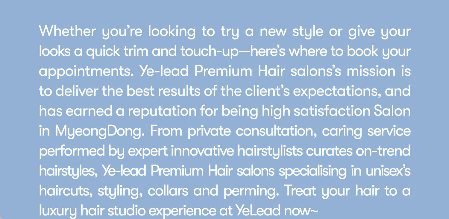 La exclusiva tecnología de teñido clínico de Ye-Lead añade las habilidades de un diseñador veterano para reducir el daño del cabello y hacer que el color sea aún más hermoso. Es una peluquería popular visitada frecuentemente por muchas personas del estilo que desea peinar, coloración especial del cabello y permanente.