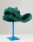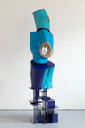 With Inhaled a Blue Moon (2021), one of the large sculptures in the exhibition, Shechet uses painted wood, powder coated steel, and silver gilding to produce a dynamic composition. As with other sculptures in the exhibition, Shechet uses color—in this case, vibrant blues—to relate dissimilar materials to one another. Inhaled a Blue Moon exemplifies the artist’s affinity for working with discordant, often unwieldy media that present challenges and questions.
