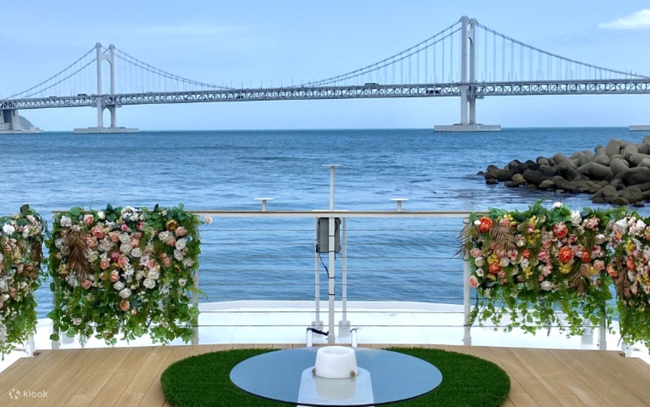 Pengalaman Lounge yang Tenang: Bersantailah di Floating Boat Lounge dengan tempat duduk yang nyaman dan pemandangan Pantai Gwangalli dan Jembatan Gwangandaegyo yang indah.