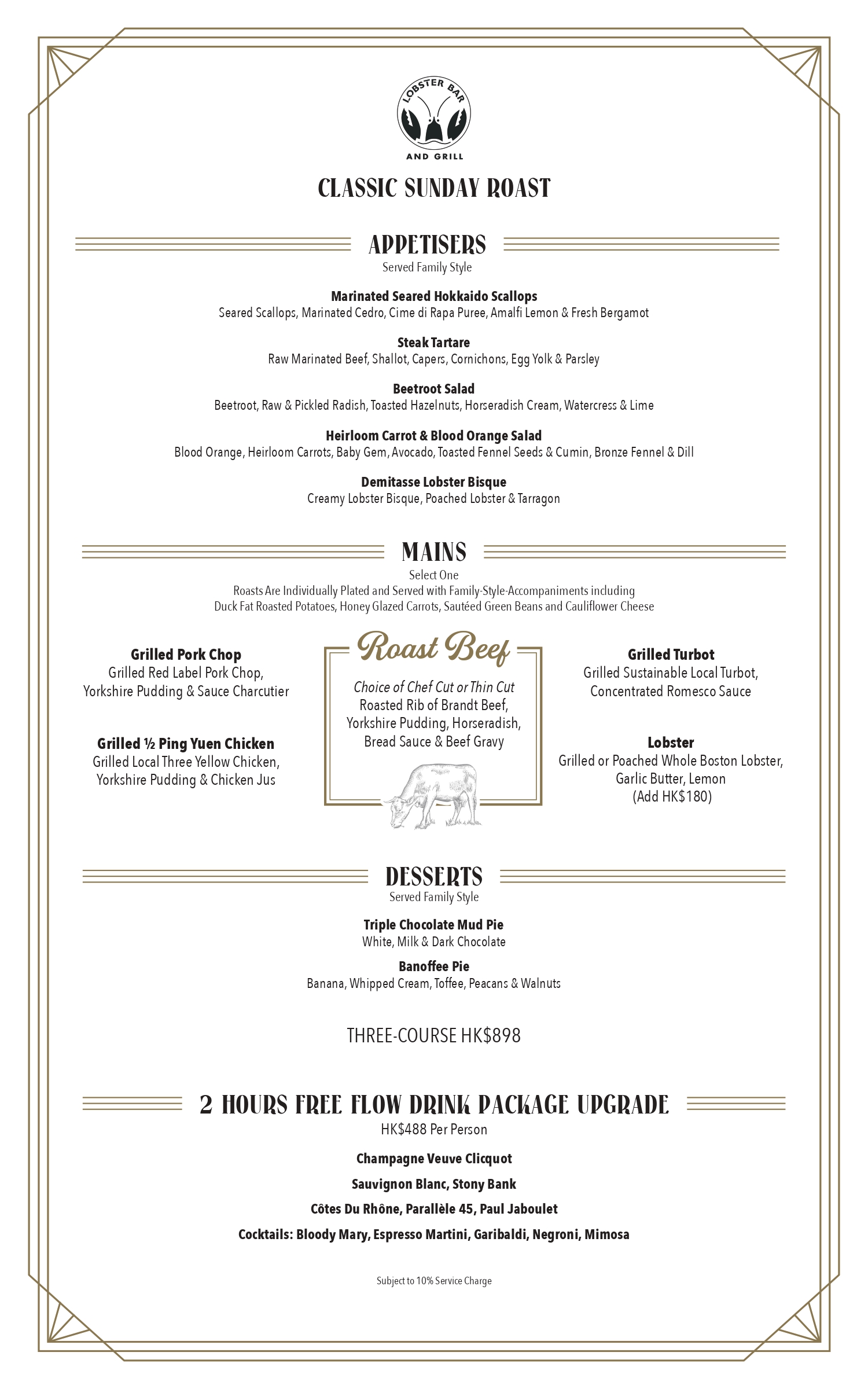 Concedetevi il nostro classico menu di tre portate per il Sunday Roast e lasciate che le vostre papille gustative esplorino. Per l’antipasto, potete scegliere tra capesante di Hokkaido marinate e scottate in padella con un sapore delicato, la consistenza tenera della tartare di manzo, la freschezza dell’insalata di carote e arance rosse, e una ricca zuppa di aragosta, ogni boccone è delizioso. Per il piatto principale, potete scegliere tra succulente costolette di maiale arrosto o un’aragosta intera di Boston arrostita o bollita, condita con burro all’aglio aromatico e limone fresco, che aggiunge sapore ad ogni boccone. Infine, non dimenticate di assaggiare i dessert canadesi tramandati dal nostro chef Cary, tra cui l’invitante torta al cioccolato fondente e la dolce e deliziosa torta alla crema di banana. Godetevi un’esperienza culinaria indimenticabile. Orari dei pasti: