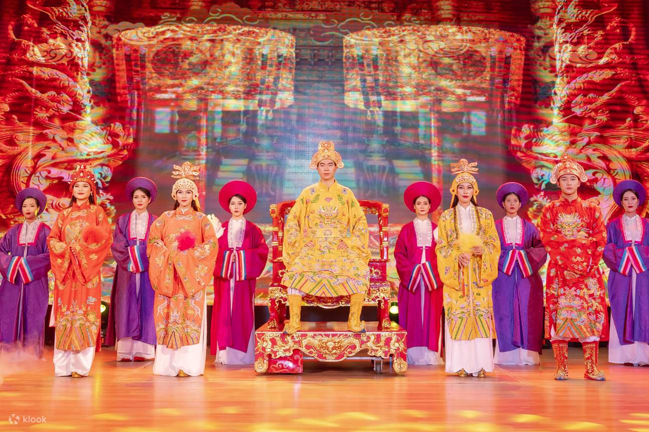 Scopri la splendida bellezza del Palazzo Imperiale durante la dinastia Nguyen nei tradizionali abiti di corte vietnamiti. Lo spettacolo Ao Dai a Da Nang ridipinge un'immagine autentica e impressionante dei maestosi costumi reali indossati da re, regine e funzionari di corte durante l'era feudale, un periodo in cui fu sviluppato il tradizionale Ao Dai del Vietnam.