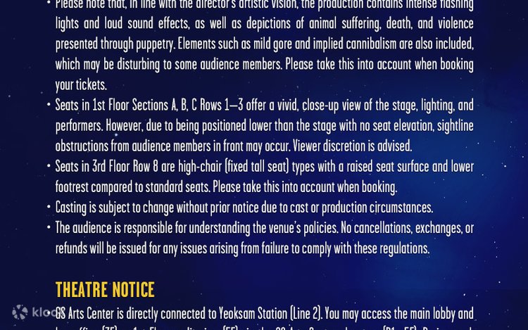 - 演出家の芸術的ビジョンのため、本作品には激しい点滅光や大きな音、パペットによる動物の苦しみ、死、暴力の描写が含まれています。また、軽度の流血や示唆的なカニバリズムなどの要素も含まれており、一部のお客様には不快に感じられる場合があります。チケットをご予約の際は、この点をご考慮ください。