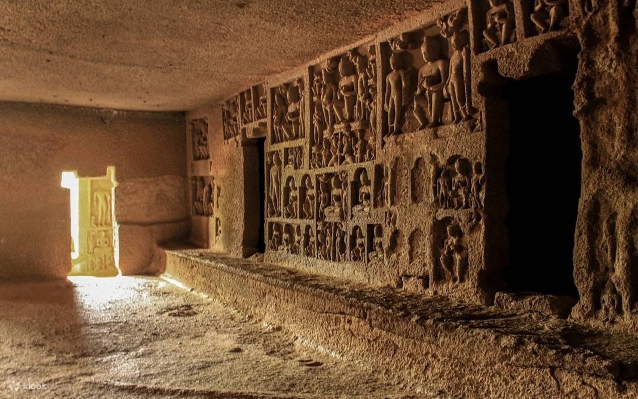 바위에 조각된 조각품이 있는 고대 동굴을 구경하세요