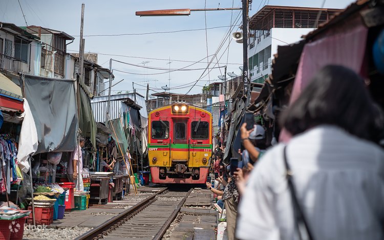 - Lihat kereta api melalui tengah-tengah pasar yang sibuk di Maeklong Railway Market