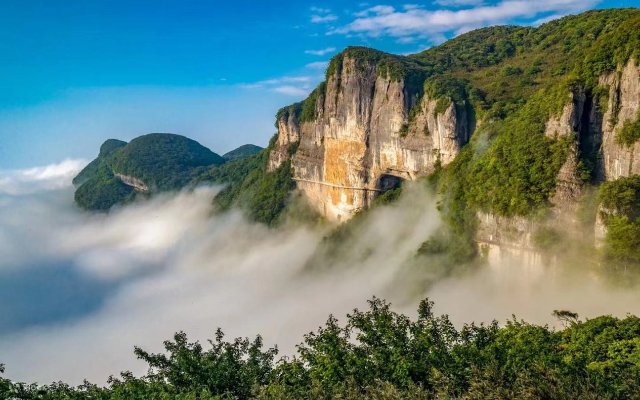 - Gunung Jinfo terletak di Daerah Nanchuan, Chongqing, merupakan tapak Warisan Alam Dunia, terkenal dengan tebing-tebing gunung yang keemasan dan lautan awan yang indah. Setiap kali matahari terbenam, gunung ini kelihatan seperti Buddha emas gergasi, dengan aura yang luar biasa. Kawasan pemandangan ini dibuka di bahagian Lereng Barat dan Lereng Utara, pelawat boleh memilih laluan klasik "naik Lereng Barat, turun Lereng Utara" untuk menikmati pemandangan panorama