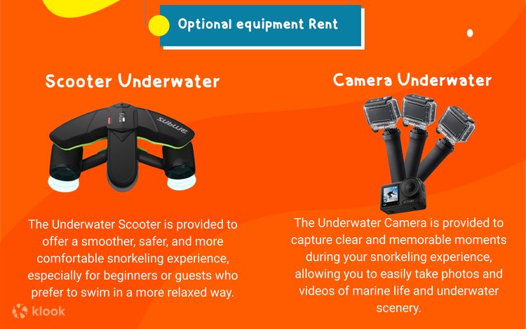 รายการเสริมเหล่านี้ไม่รวมอยู่ในแพ็กเกจดำน้ำตื้นมาตรฐาน ผู้ใช้บริการที่ต้องการเพิ่มอรรถรสในการดำน้ำตื้นให้สะดวกสบายและผ่อนคลายยิ่งขึ้น สามารถขออุปกรณ์เพิ่มเติมได้ เช่น สกู๊ตเตอร์ใต้น้ำ หรืออุปกรณ์ใต้น้ำอื่นๆ