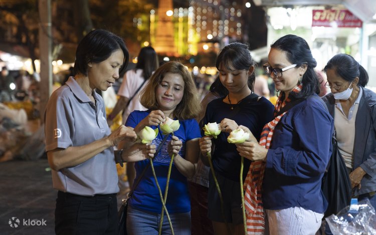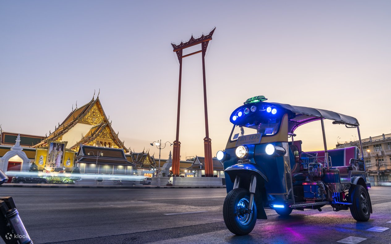 Tiếp tục chuyến du ngoạn này để xem và chụp ảnh tại Giant Swing, một công trình kiến trúc cao 30 mét. Điểm dừng chân tiếp theo sẽ là một khu chợ đêm, nơi bạn có thể dạo qua các gian hàng nhộn nhịp, tìm hiểu về các món ngon địa phương và nếm thử vô số món ăn đường phố từ thịt nướng kiểu Thái đến bánh pudding dừa. Kết thúc buổi tối tại một quán bar trên tầng thượng bên bờ sông thư giãn trong khi nhâm nhi một thức uống mát lạnh và ngắm nhìn khung cảnh tuyệt đẹp của Sông Chao Phraya và những tòa nhà chọc trời trước khi tạm biệt người lái xe tuk tuk của bạn tại ga MRT gần nhất.