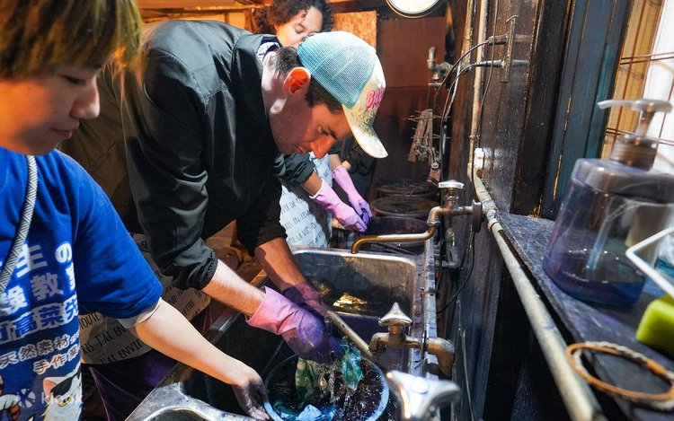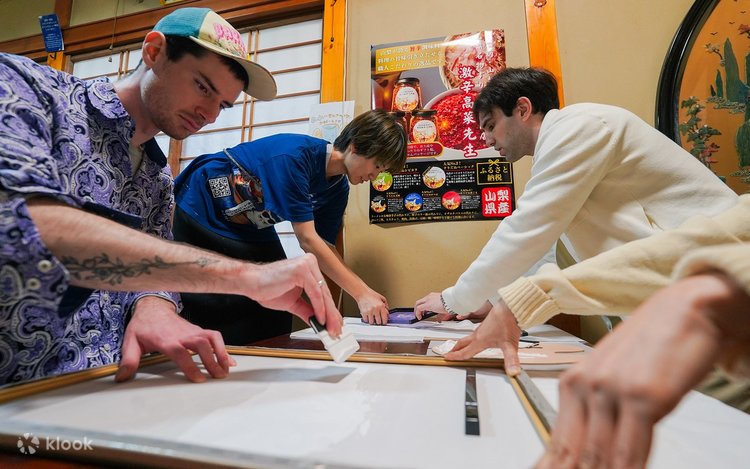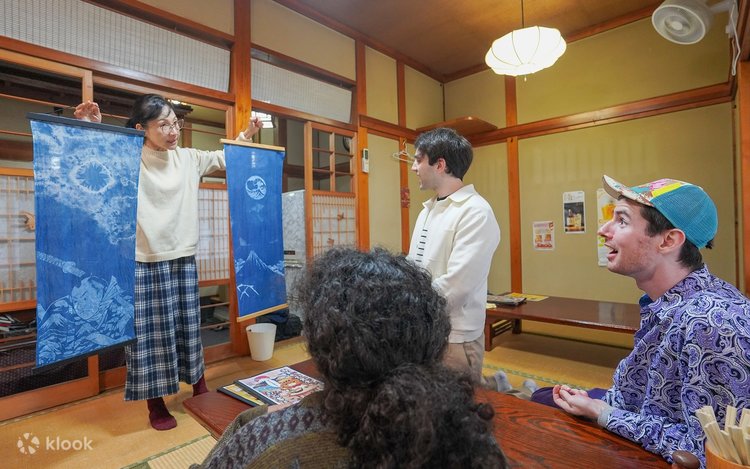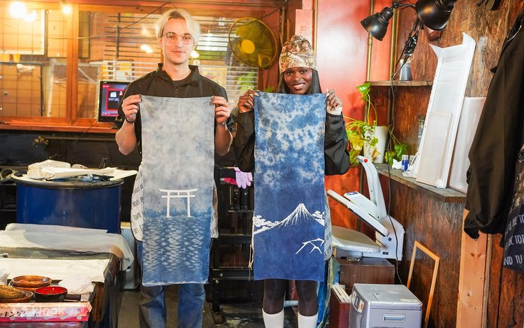 首先,您将会见一位友善的当地导游,他将为您介绍「日本蓝」的历史与意义,这种标志性的靛蓝色自江户时代以来便深受珍视。您将会领取一条手拭巾,并从多种绞染技术中选择,设计您的染色图案,可参考范例作品和丝网印刷图案来获取灵感。将布料折叠并绑好后,将其浸入靛蓝染缸中,看着它在氧化过程中从绿色转变为深蓝色。接着冲洗,展现您独特的图案。待布料干燥并熨烫后,您可以选择富士山或浮世绘人物等日式图案,将其丝网印刷到您的布料上。最后熨烫完成后,您独创的日式挂轴就大功告成了。别忘了拍张纪念照,将这份独一无二的纪念品带回家!