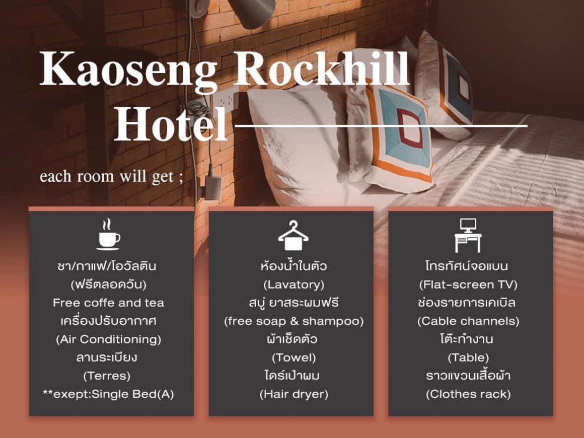 Great care is taken to ensure guests experience comfort through top-notch services and amenities.Remain linked during your visit by utilizing the complimentary internet access available.The hotel offers complimentary parking for guests who arrive with their own mode of transport.Repeatedly enjoy your best-loved attire with the aid of the laundry service available at Kaoseng Rockhill Hotel.The hotel is completely smoke-free.Crafted for coziness, every guestroom provides an array of features, guaranteeing a tranquil night's sleep while maintaining the level of comfort. For an elevated experience at hotel, select rooms are equipped with air conditioning to improve your stay.For certain chosen rooms, guests can enjoy in-room amusement like television and cable TV as a part of their stay. Rest assured that your hydration needs will be met, as some guestrooms are equipped with a refrigerator and mini bar. Kaoseng Rockhill Hotel offers toiletries and towels in the restrooms of specific accommodations. Do you possess exceptional culinary skills? Prepare your meals personally within the hotel at its BBQ facilities.