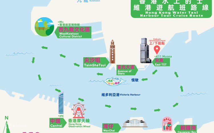 - 航線涵蓋維多利亞港內最著名的景點: 中環摩天輪, 國際金融中心, 中銀大廈, 尖沙咀海濱長廊 , 星光大道, 西九文化區等