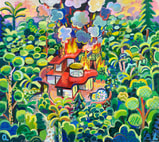 Lozano 所描繪的那些繁盛場景示範了「混亂」和「寧靜」如何共存,也暗示了在燥動的環境之中如何尋得平息。雖然戶外生氣煥發的植物與室内的家具設置所構成的和諧感會令觀衆感受到安全和舒適感,但這種平靜也因各種混亂——包括燃起的物件、凌亂的空間和壯觀的自然植物而被打破。“Running on Fumes”除了直接指向他作品中出現的火焰之外,煙霧這個符號也具備了半抽象的意味,隱喻了藝術家自省的過程。雖然煙霧的出現非常短暫,但其流淌於空氣的時候卻已經能夠溫暖一個家,它的流動感也暗喻着藝術家作畫過程中無拘無束的幻想和概念。