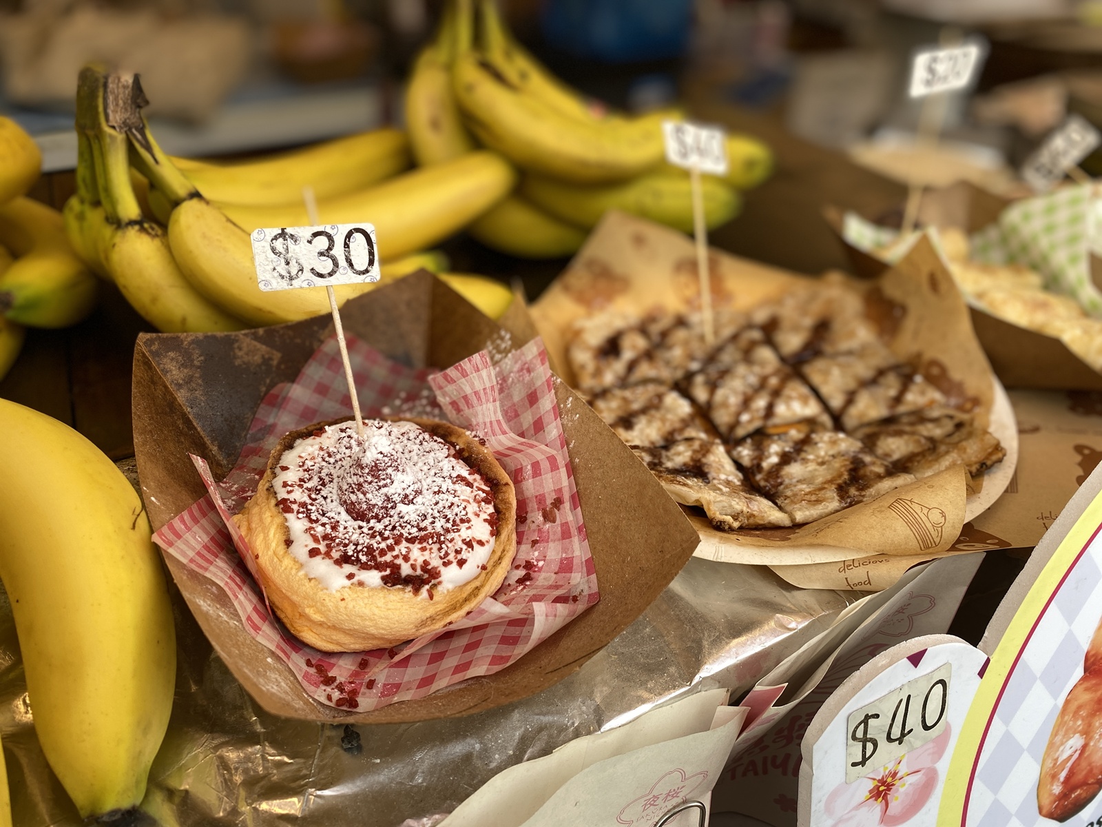 - 創新甜點:冰糖葫蘆、芒果糯米糍、榴槤千層蛋糕、玫瑰班蘭水晶糕、楊枝甘露、芋圓盛、梳乎里、雪米糍、爆漿玉子燒等
