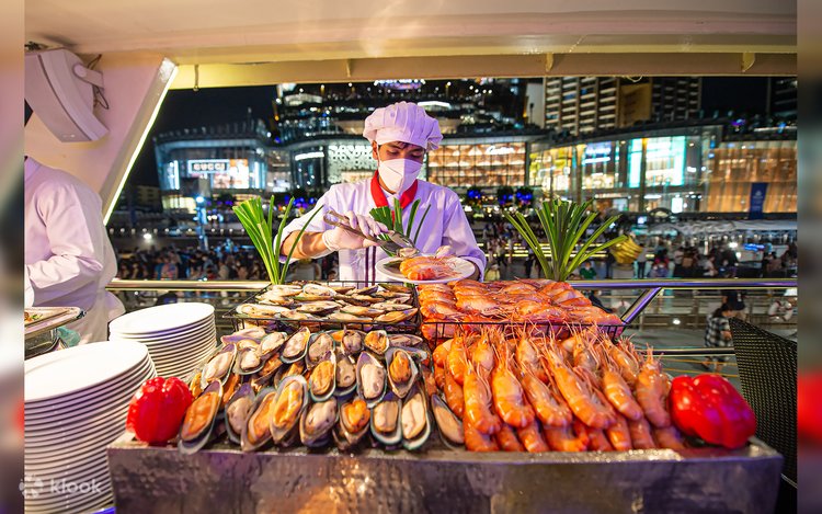 一邊享用船上美味佳餚,一邊欣賞河畔璀璨夜景,享受難忘的曼谷晚餐體驗