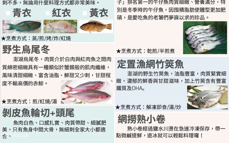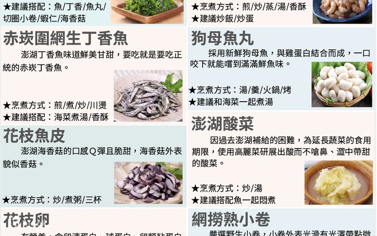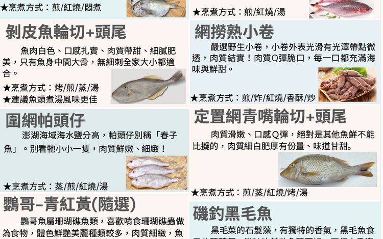 - 尾網肉魚 400-450g、野生血雕(盤仔魚) 300-350g、野生定置漁網烏尾冬 350-400g、尾網午仔魚 350-400g、定置網青嘴輪切+頭尾 600-650g、船釣雀鯛(咬破布) 400-450g、船釣玳瑁石斑 350-400g、網撈熟小卷200-250g、圍網三文卷 200-250g、三文尾小卷切圈 200-250g、澎湖野生海菜2盒 每盒200-250g、赤崁圍網生丁香魚 200-250g、花枝魚皮 300-350g、花枝卵 250-300g、金鉤蝦仁 250-300g、狗母魚丸 200-250g、澎湖酸菜 150-200g