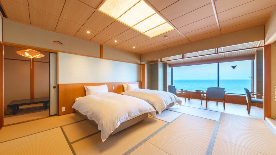 可以眺望日本海日落景觀的溫泉旅館。請品嚐食之都「莊内」的四季時令料理